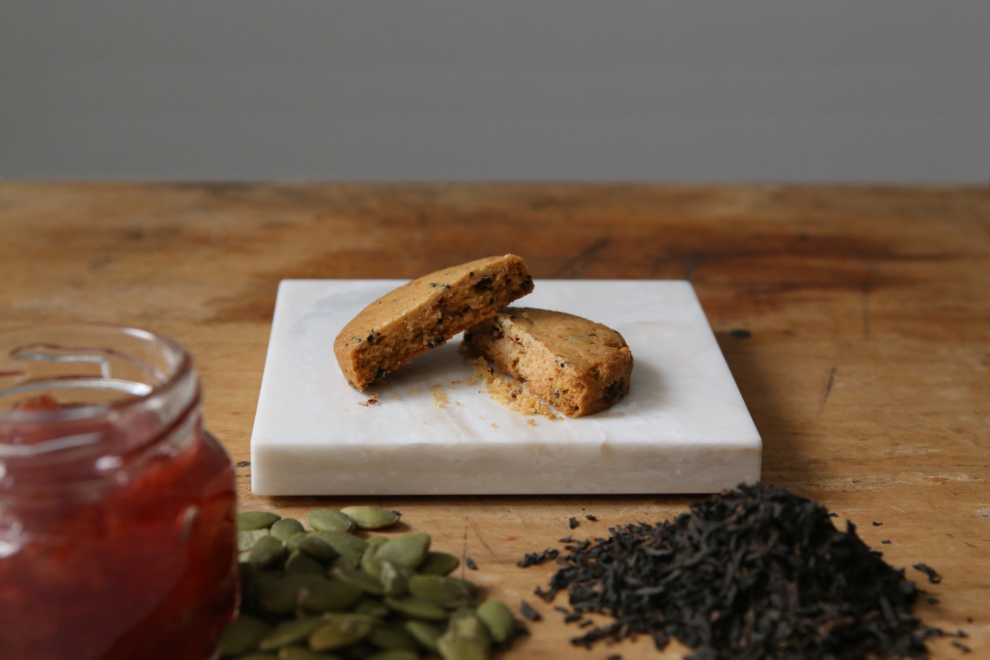 しっとりと柔らかいセミドライいちごとアールグレイの茶葉を練り込んで焼き上げました。噛みしめる度に、セミドライいちごの控えめな甘さの奥に、アールグレイの茶葉の爽やかな香りがひろがります。
