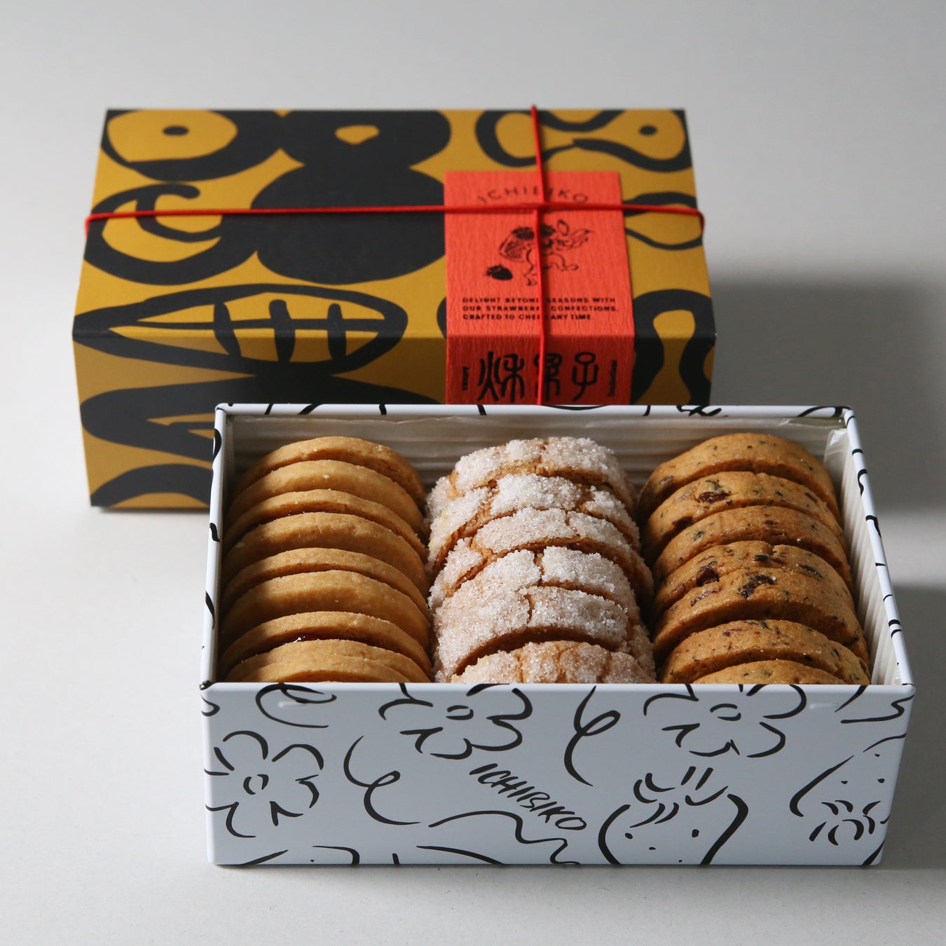 甘酸っぱいいちごジャム、しっとり柔らかいセミドライいちご、ふわりと香りひろがるいちごパウダーを使った3種類のクッキーをつめあわせたいちごづくしのクッキー缶です。