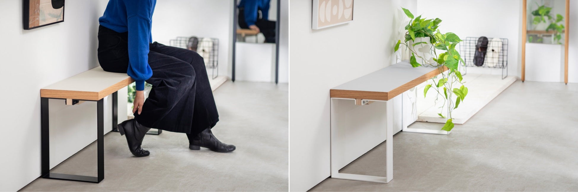 ダイニングに置いて座るだけでなく、リビングの一角でお気に入りのアイテムをディスプレイしたり、エントランスでお出かけ前にちょっと腰掛けたり。アイデア次第で様々なシーンに活用でき、お部屋のアクセントとなる便利なプロダクトです。
