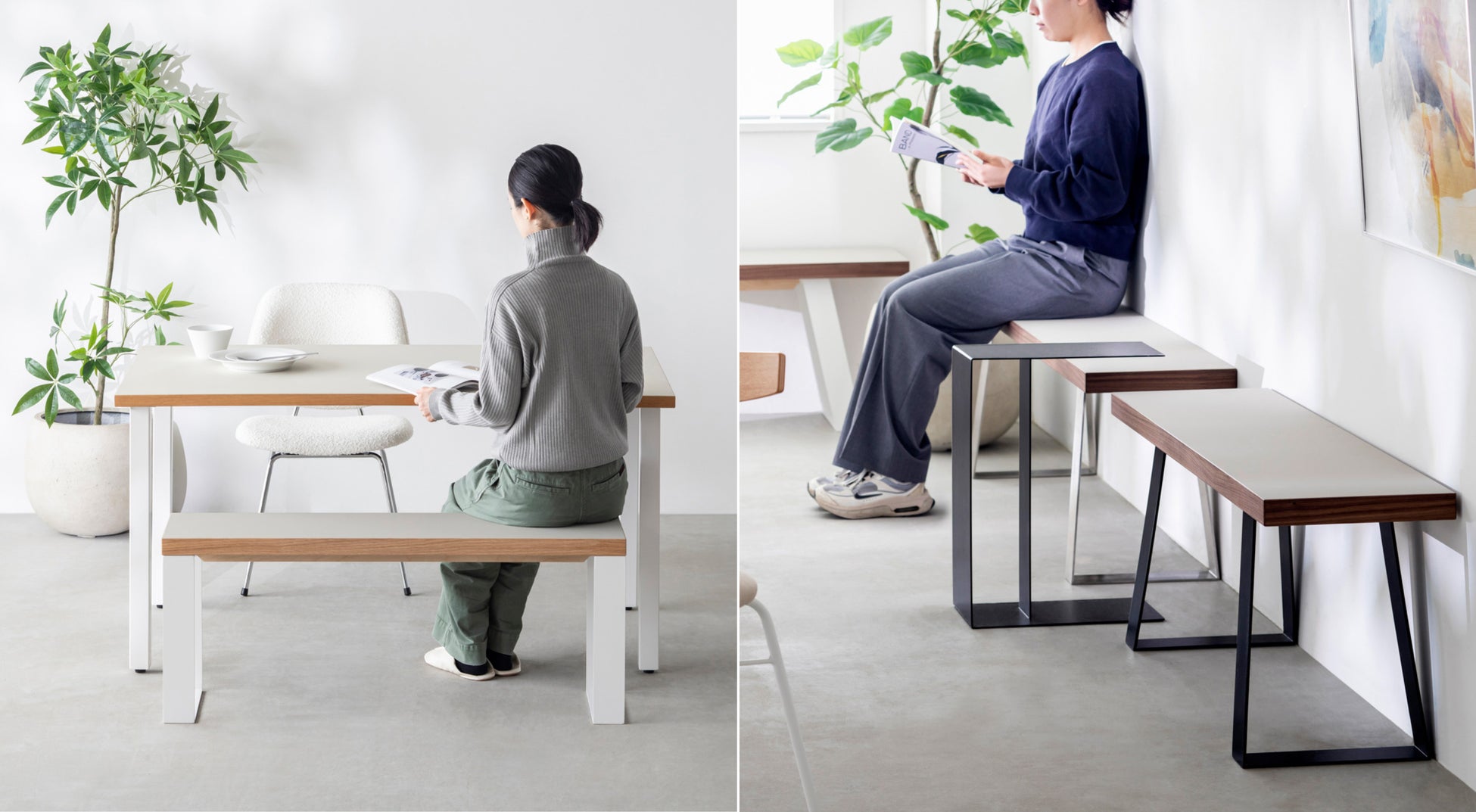 同じカラーのテーブルと合わせると、統一感のあるダイニングに。ベンチの幅はテーブルの脚と脚の距離より約10〜30cm短くするのがおすすめです。