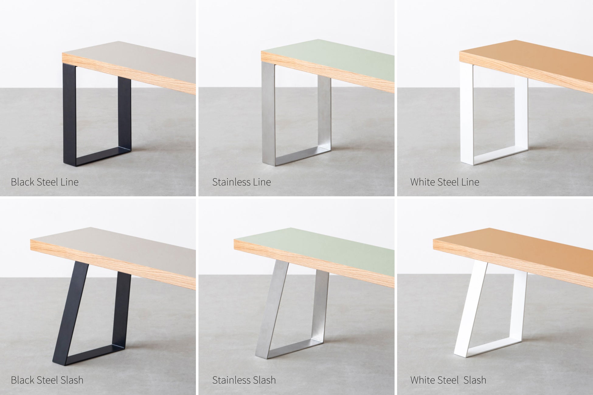 脚は3色×2タイプの計6種類をご用意。空間や用途に合わせた幅のサイズオーダーも可能で、自由度の高いカスタマイズを叶えることができます。