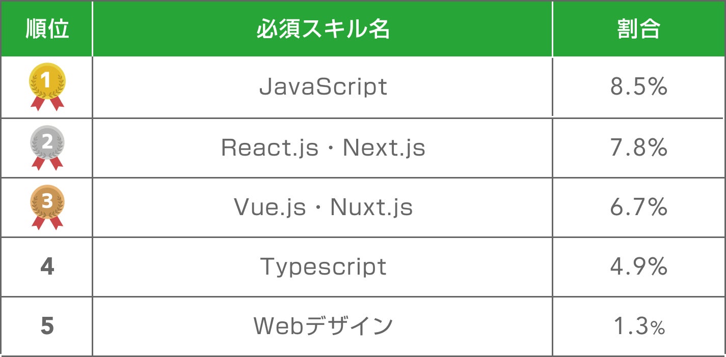 求められるスキルはJavaScript、React.js・Next.js、Vue.js・Nuxt.js、Typescript