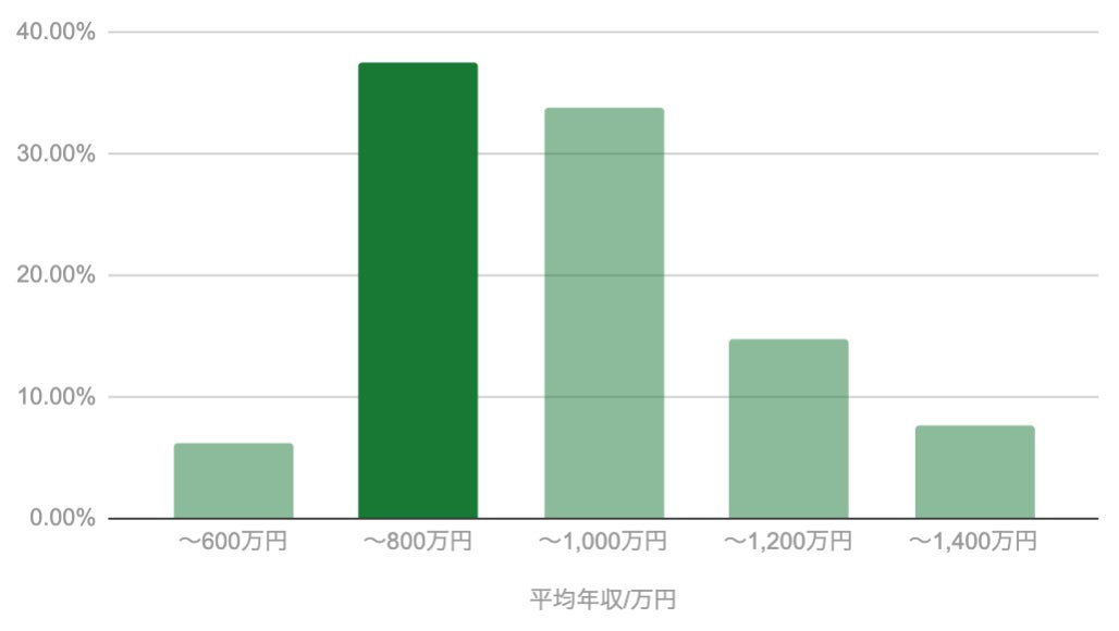 一般的な平均年収599万円よりも、+268万円高い。全案件の56%が年収800万円超