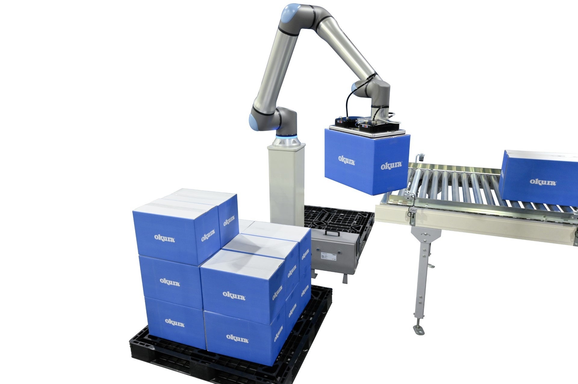 一方オークラは、重量ワークの高速積み付けに適した高可搬(100㎏~350㎏タイプまで)産業用ロボットを活用したパレタイジング用ロボットが多くの工場や倉庫に採用されているものの、人手不足を背景に軽量物のパレタイズを手軽に自動化したいという需要が拡大。この需要に対応すべく高品質、信頼性、革新性などにより協働ロボット市場で圧倒的な評価を得ているURロボットを組み込んだパレタイジング用ロボットのラインナップ化を検討していました。