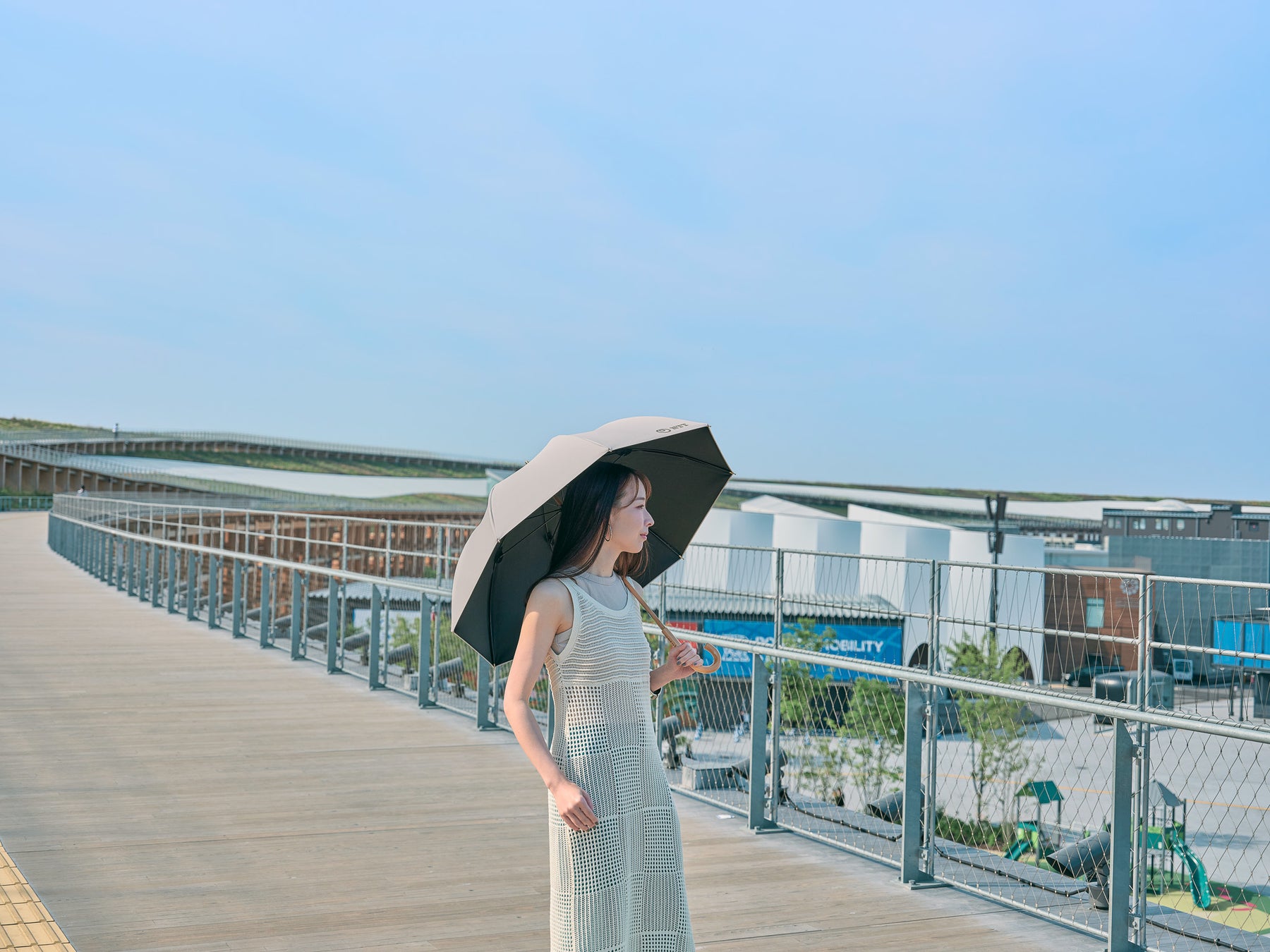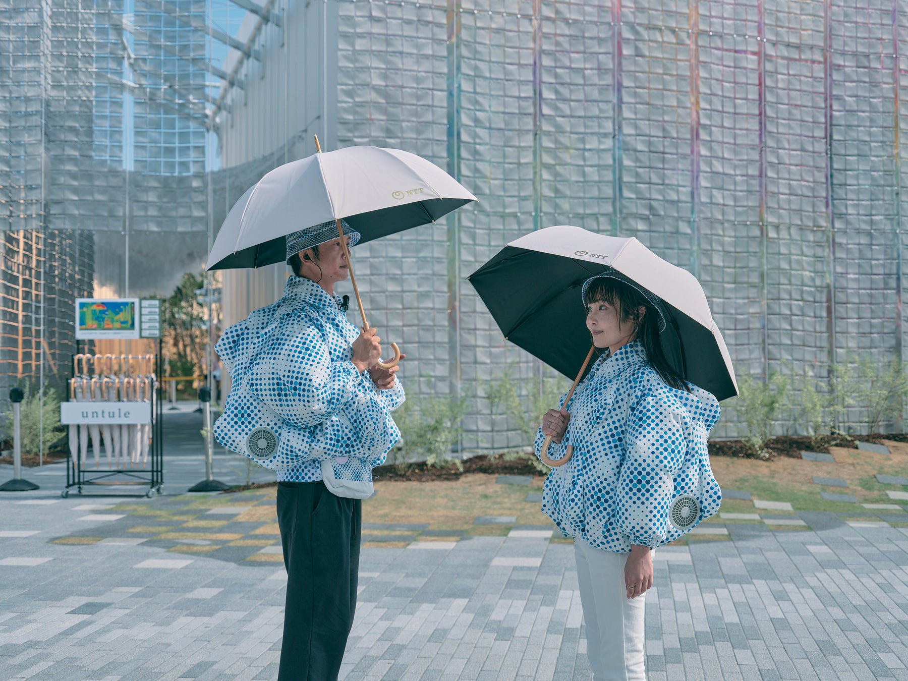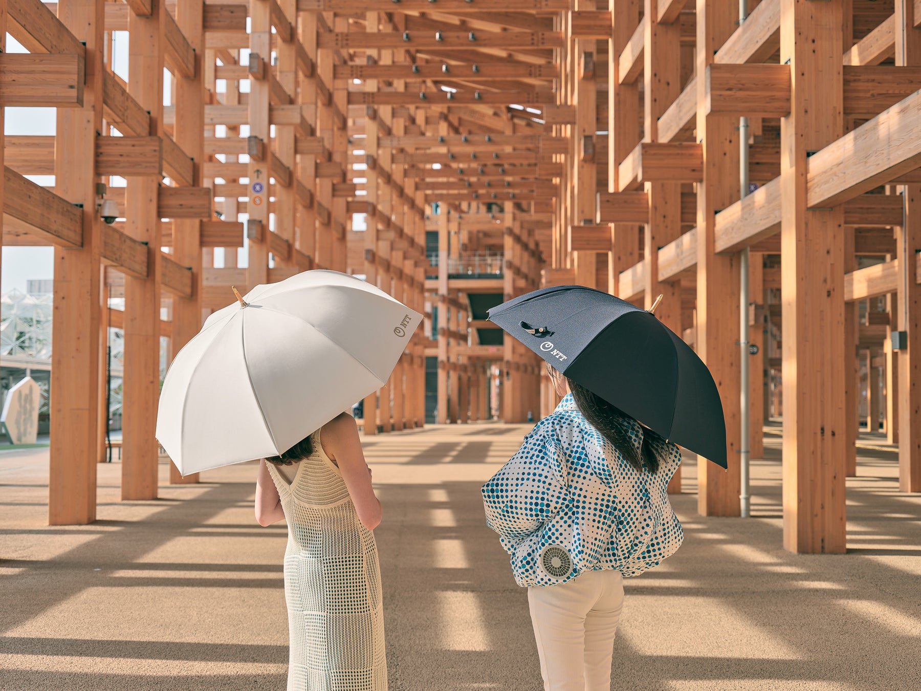 地球環境や健康への意識が高まる中、万博を訪れるすべての人々が快適に屋外を過ごせるよう、NTTパビリオンではuntuleの完全遮光日傘を無料で貸し出しています。