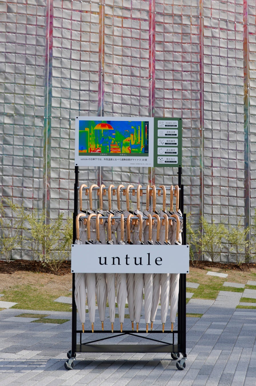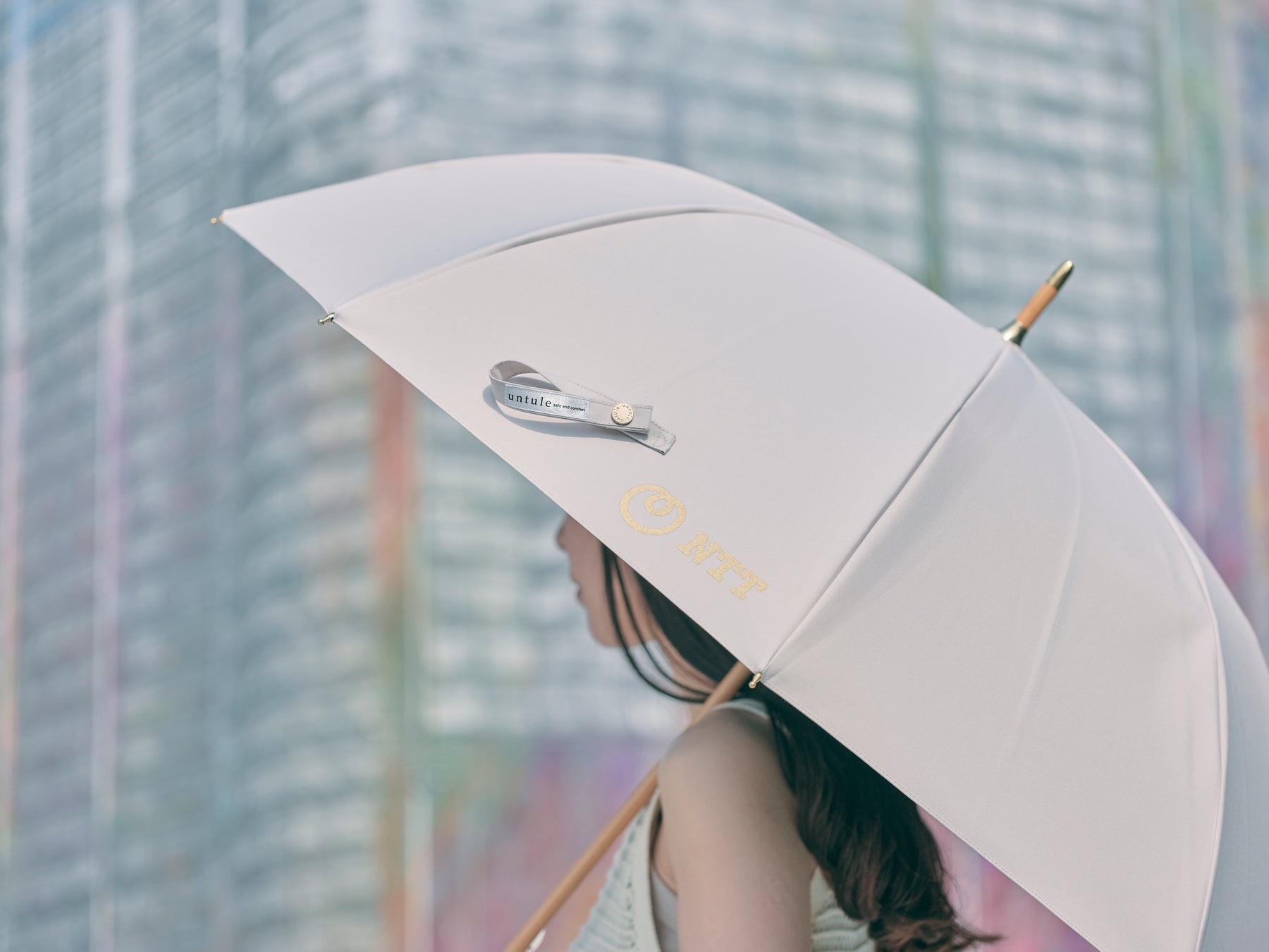 貸し出す日傘は傘地にNTTロゴがプリントされ、木製の持ち手にuntuleのロゴをレーザー加工した特別仕様品となっています。
