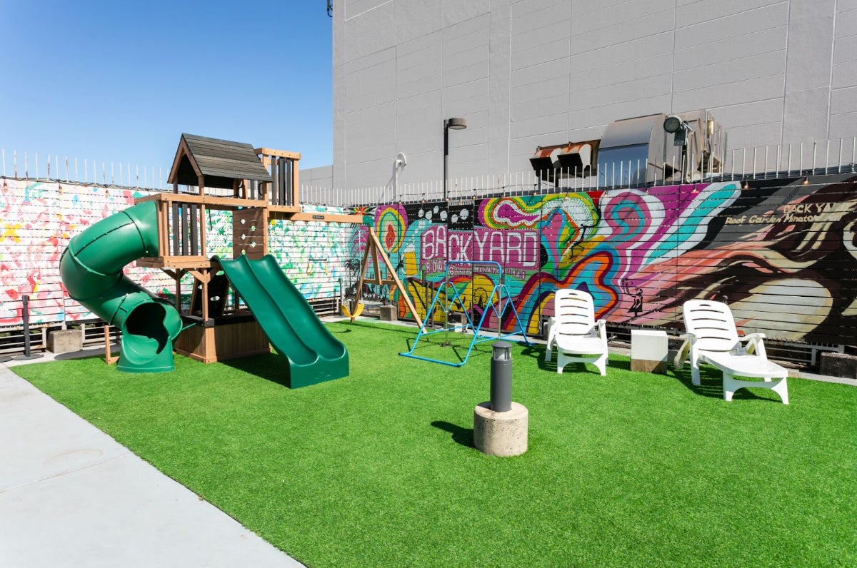 BACK YARD - Roof Garden Minatomirai-は、横浜・みなとみらいの景色が一望できる横浜ワールドポーターズ屋上のBBQビアガーデン施設です。洗練されたデザインとポップな色使いが融合した特別な空間で、ビアガーデンやリズミカルな音楽イベント、独特のコラボレーションメニューをお楽しみいただけます。さらに同店舗では様々な遊具を備えたキッズエリアも設けており、お子様連れのご家族も気兼ねなくご来店いただけるよう設計しています。
