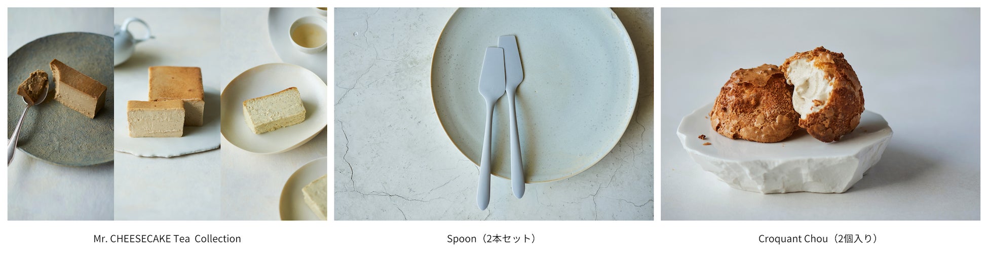 事前予約制の「Mr. CHEESECAKE Holiday Market Cafe(イートイン)」には、「Mr. CHEESECAKE pistachio raspberry」とオリジナルブレンドティー、そして本イベント限定で登場するシェフ田村オリジナルの「Croquant Chou(クロッカンシュー)」とのセットメニューをご用意。クロッカン生地を乗せて焼き上げたザクっと食感のシューと、世界遺産「武夷山」のみで生産される貴重な烏龍茶「岩茶」を使ったスパイシーで香ばしいクリームを組み合わせた、他にはない味わいのクロッカンシューです。事前予約なしで当日購入可能なテイクアウトメニューには、ホリデー限定フレーバーや通常フレーバーをはじめ、お茶を使った3種類のフレーバー「Tea Collection」、Mr. CHEESECAKEのために開発された「Spoon(2本入り)」、そして「Croquant Chou(2個入り)」をご用意しました。さらに、器作家の大渕由香利氏に制作いただいた、ホリデー限定フレーバーのためのプレートを特別に販売します。