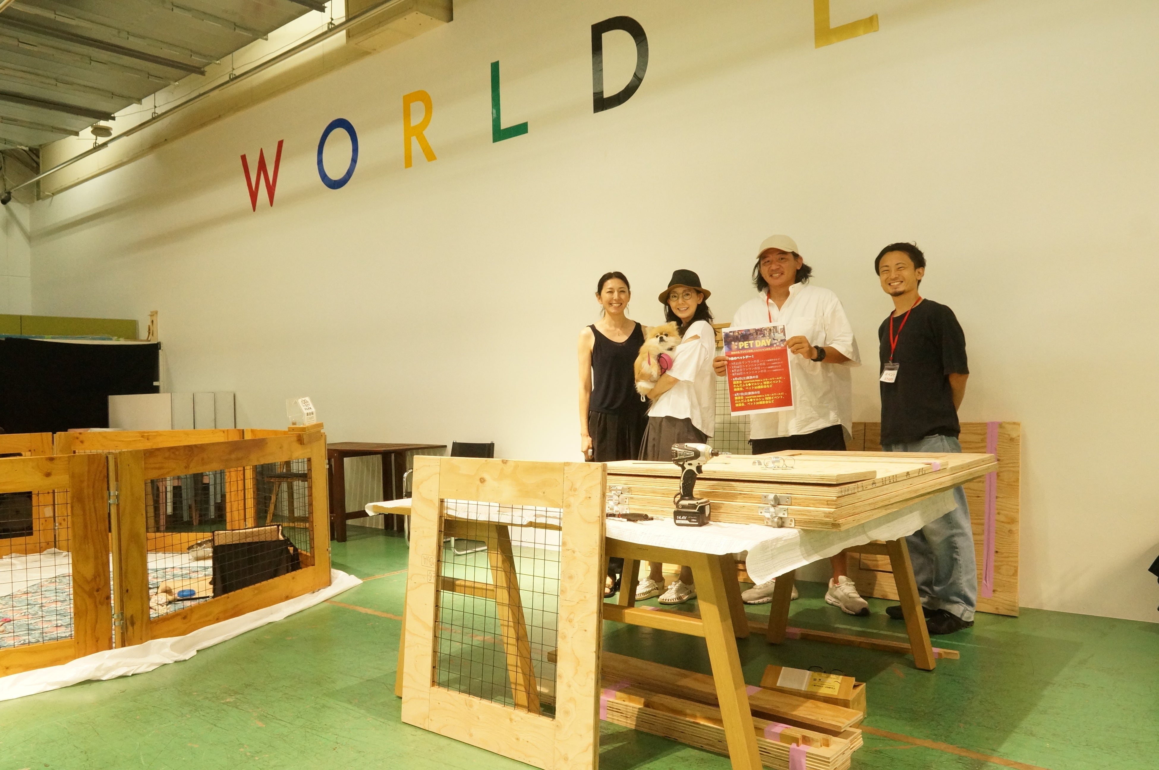 スモワルでは、毎月11日はワンワンの日、22日はニャンニャンの日とし、ペットと一緒に楽しんでいただけます。また、年に何回か「家族の日」と称して譲渡会を開催しています。その譲渡会で使うゲージをつくります。