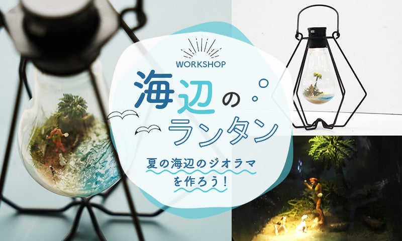 ランタンタイプのライトボトルの中に、夏の海辺のジオラマを作ろう!LEDライトのつくライトバルブの中に砂浜、水辺とフィギュアを配置して海辺の風景を作るワークショップです。ボトルシップのように瓶の中で作業するので、ちょっとだけ集中力が必要ですが、ミニチュアのジオラマ作りの楽しさを存分に楽しむことができます。(※上級者向けワークショップ)
