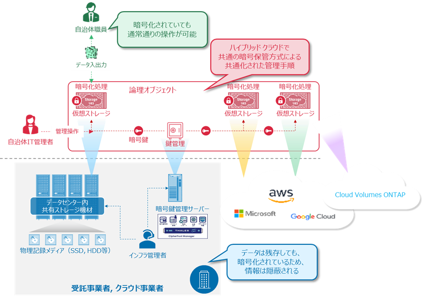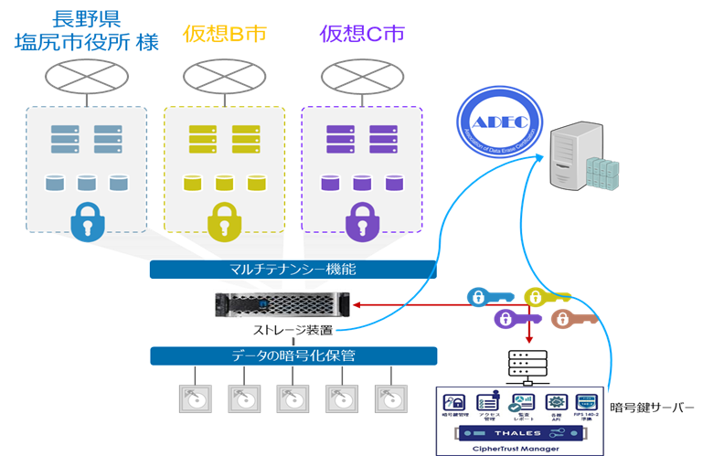 対 象 : 株式会社電算様のデータセンターにネットアップの検証用ストレージを設置し、仮想の塩尻市様、仮想B市などのテナントを構築し仮想住民データを格納。暗号化鍵の管理と消去を実施
