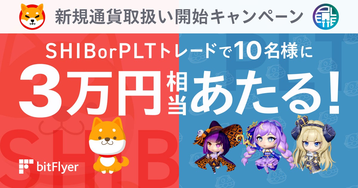 SHIB、PLT を 1 万円以上 bitFlyer で取引した方の中から抽選で 5 名様ずつに 3 万円分の SHIB、PLT がそれぞれあたる!