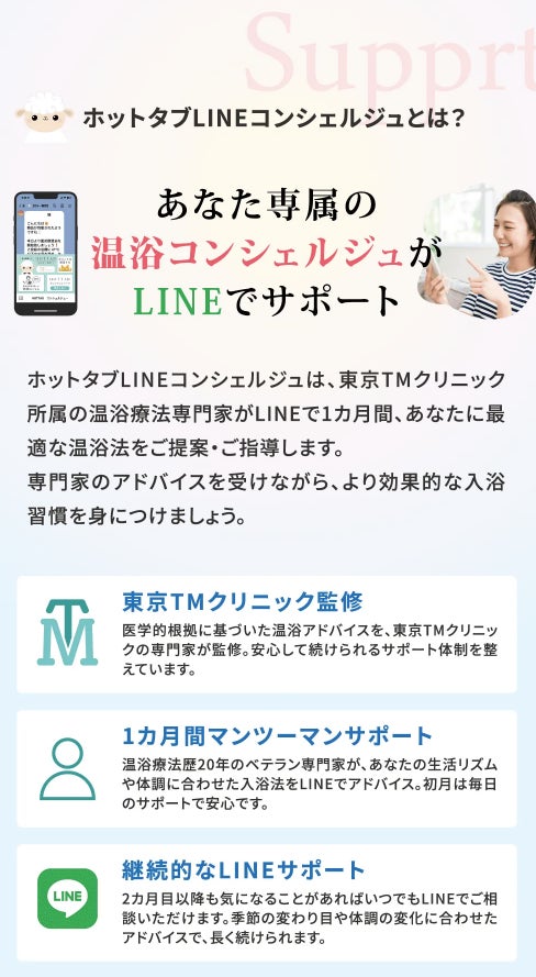 ホットタブLINEコンシェルジュは、東京TMクリニック所属の温浴ケア専門家が、1カ月間LINEを通じてあなたに合った温浴習慣をサポートするサービスです。専門家のアドバイスを受けながら、無理なく続けられる入浴習慣づくりをお手伝いします。