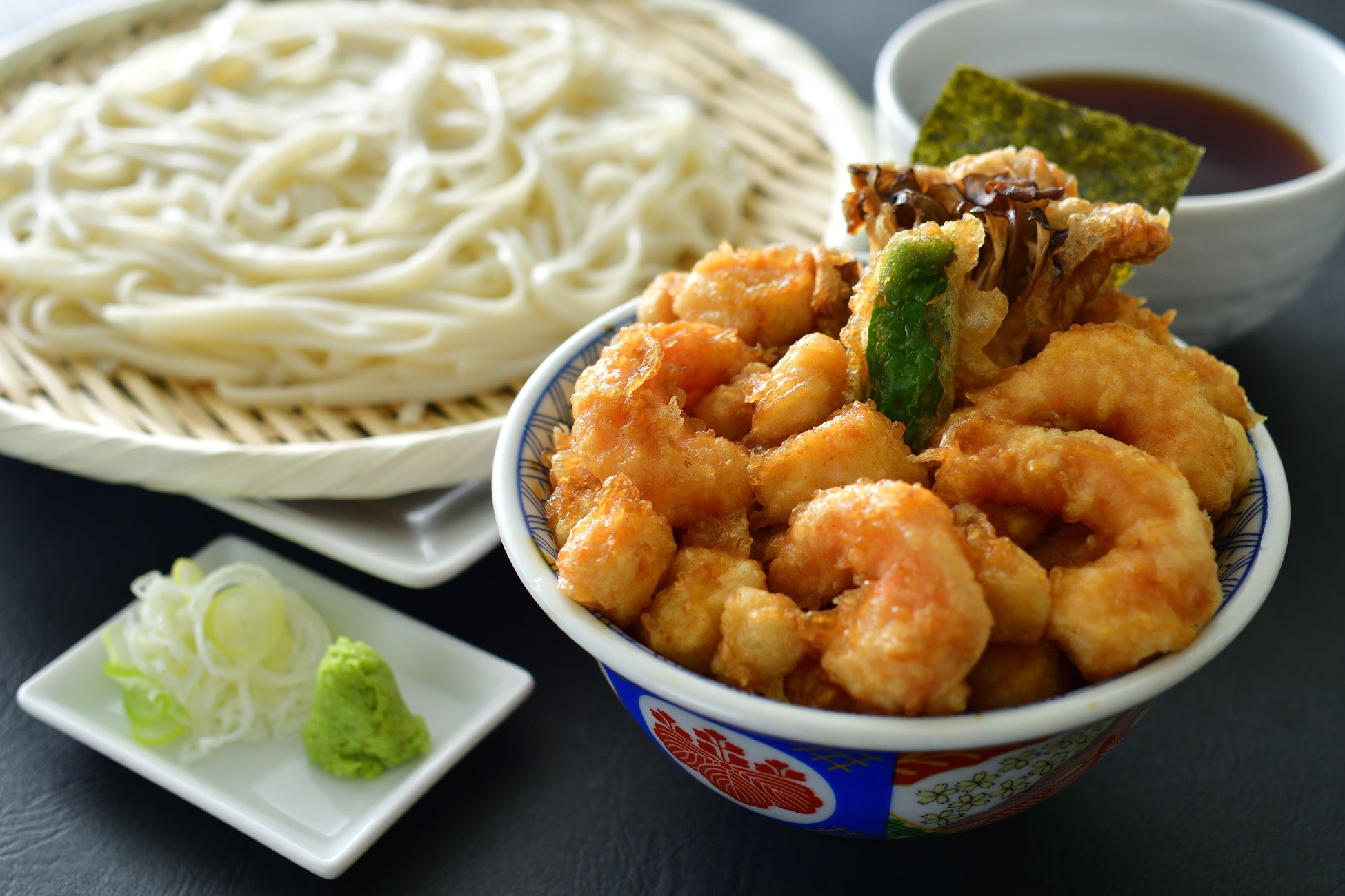 天ばらめしは、海老、いか、小柱、舞茸、ししとう、海苔の天ぷらを秘伝の丼たれでごはんに絡めた逸品です。稲庭うどんは、冷たいものと温かいものからお選びいただけます。