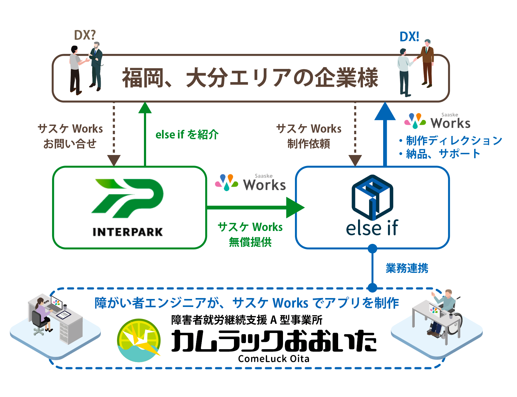 株式会社インターパークは、カムラックおおいたに自社が開発を手掛けるノーコード業務アプリ開発ツール「サスケWorks」のライセンスを無償提供します。株式会社else ifは福岡、大分を中心とした九州エリアの企業、公共団体等向けにサスケWorksの導入を推進し、受注した案件は、株式会社else ifの指揮のもと、カムラックおおいたと障がい者も含めた開発チームを結成し、業務を担当していきます。
