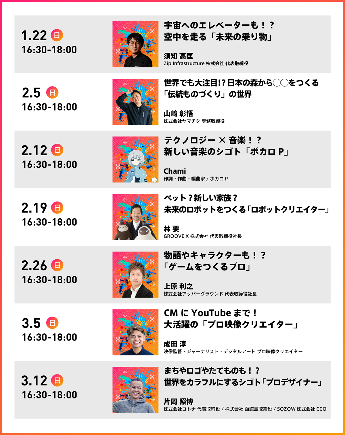 子ども向け「未来のシゴトを体験編<1/22(日)〜3/12(日)>」では、ゲームプランナー、プロデザイナー、ロボットクリエイター、音楽ボカロP、映像クリエイター、発明家などさまざまな業界で活躍する「プロ」が未来の仕事や生き方について語るライブを実施します。保護者向け「新時代の教育・子育て編<2/23(木・祝)>」では、日本・海外を問わず新しい視点で教育や子育てを経験しているゲストを招いて特別ライブを実施いたします。