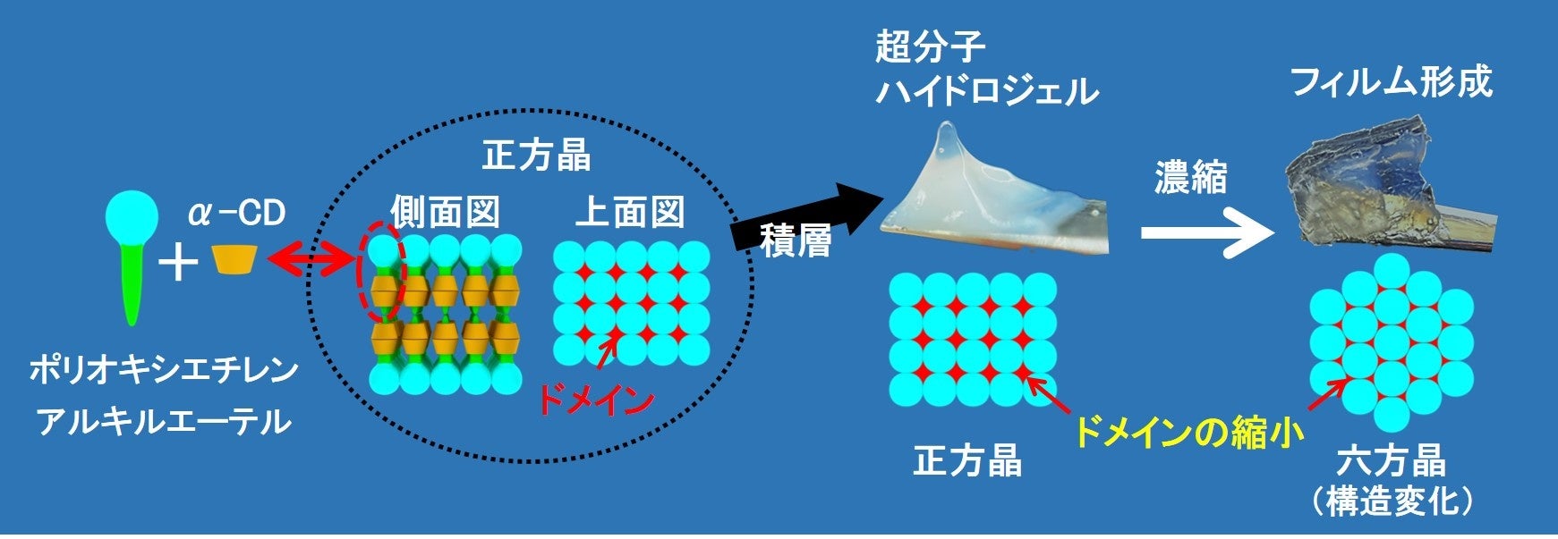 形成された超分子ハイドロジェルは、正方晶充填で分子配列した構造が高次元に積層していることが確認され、この構造体には空間(ドメイン)が存在することも確認されました。