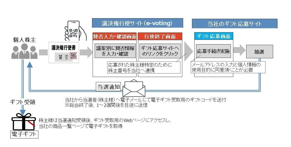 本サービスは三菱UFJ信託銀行のインターネット議決権行使サイト(e-voting)から、当社のギフト応募画面に遷移し、株主目線でシームレスに応募が可能になります。
