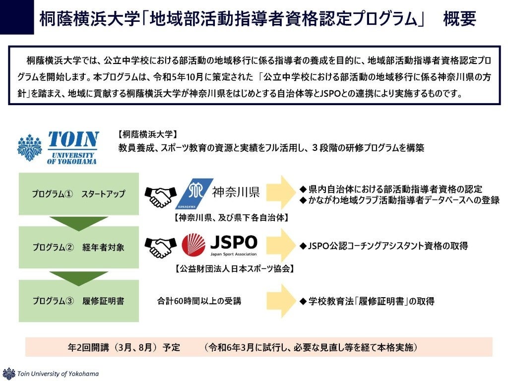 神奈川県との協力・連携をはじめ、県内各自治体が進める取り組みとも連携しつつ、地域部活動指導者を養成するプログラムです。JSPO(正式名称:公益財団法人日本スポーツ協会)とも連携し、スポーツ指導者基礎資格にあたる「JSPOスポーツコーチングリーダー(旧コーチングアシスタント)」の資格を取得できるプログラムとなっています。本プログラムの修了者は、神奈川県が運営するスポーツや文化活動の指導者が登録する広域的な人材バンクである「かながわ地域クラブ活動指導者データベース」に登録するなどの連携を想定しています。