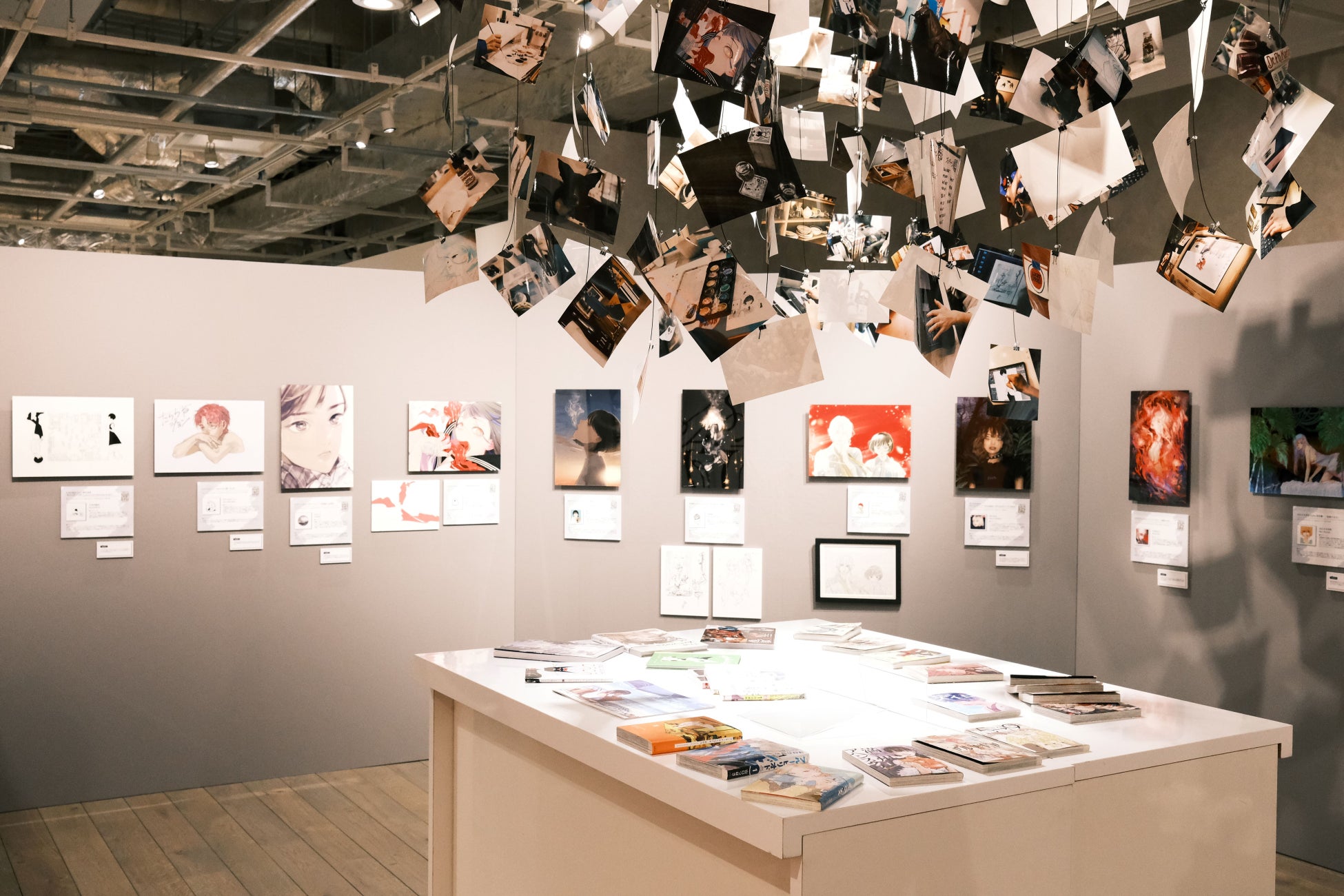 会場内は2区画にわかれており、1区画目はデジタル作品のアクリルプリント展示となっており、21作品が一堂に会している。作品によっては、制作途中段階の資料としてのラフスケッチの展示や、仕上げ前のアナログ原画なども展示。さらに会場中央には映像の撮影時に並行して撮影された制作環境の風景写真などもインスタレーションとして展示されている。