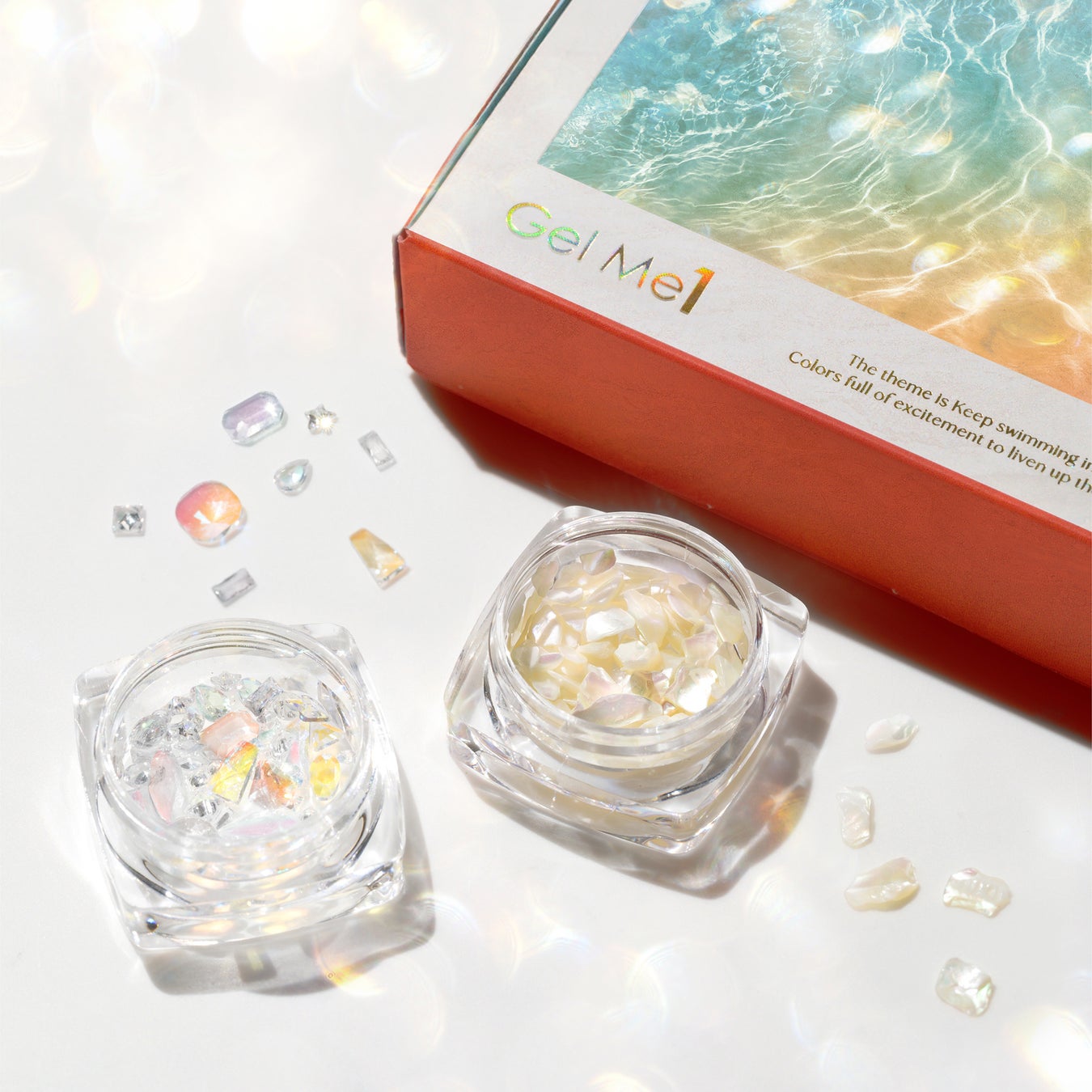 テーマの「éclat」に合わせて輝きやかけらをイメージした偏光ストーンパーツと不規則な形のシェルパーツで、涼しげな雰囲気を演出し刺激的な限定色と一緒にお楽しみいただけます。