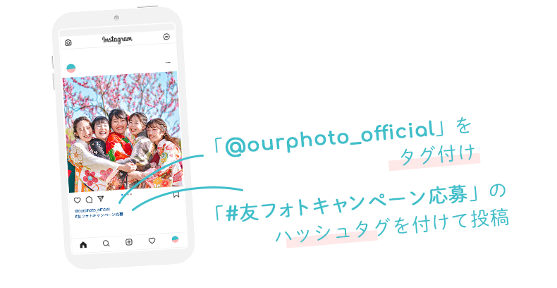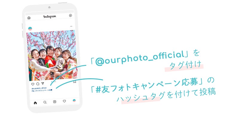 内 容:2022年2月21(月)〜3月20日(日)の期間に依頼をし、2組(2人)以上の友だちグループで撮影した写真(OurPhoto納品写真)を、2022年2月21日〜4月20日の期間内にInstagramに投稿していただくと、対象者の中から抽選で3名様に次回の撮影で使える15,000円分撮影クーポンをプレゼントします。※投稿には、「@ourphoto_official」のタグ付け&「#友フォトキャンペーン応募」のハッシュタグが必須です。
