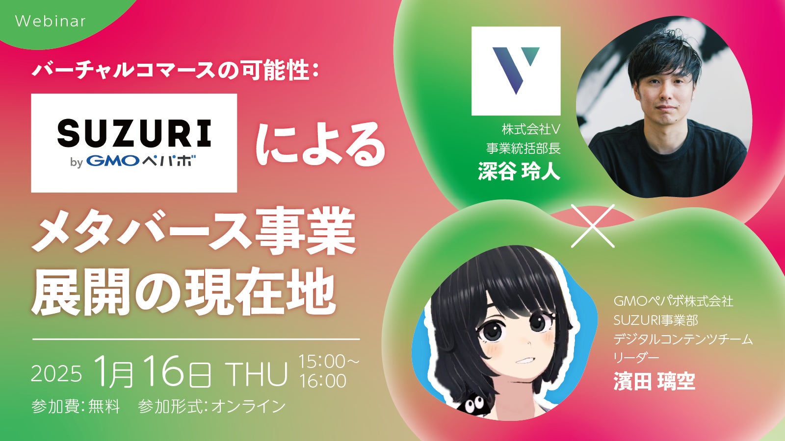 株式会社V(本社:東京都品川区、代表取締役兼CEO:藤原光汰、以下 V)は、2025年1月16日(木)15時より、第2回オンラインセミナー「バーチャルコマースの可能性:SUZURI byGMOペパボによるメタバース事業展開の現在地」を開催することをお知らせいたします。 GMOペパボ株式会社 (以下、GMOペパボ)SUZURI事業部デジタルコンテンツチーム リーダー 濱田 璃空様をお迎えし「バーチャルコマースという新領域に挑戦する際の実践的な知見」についてお話を伺います。