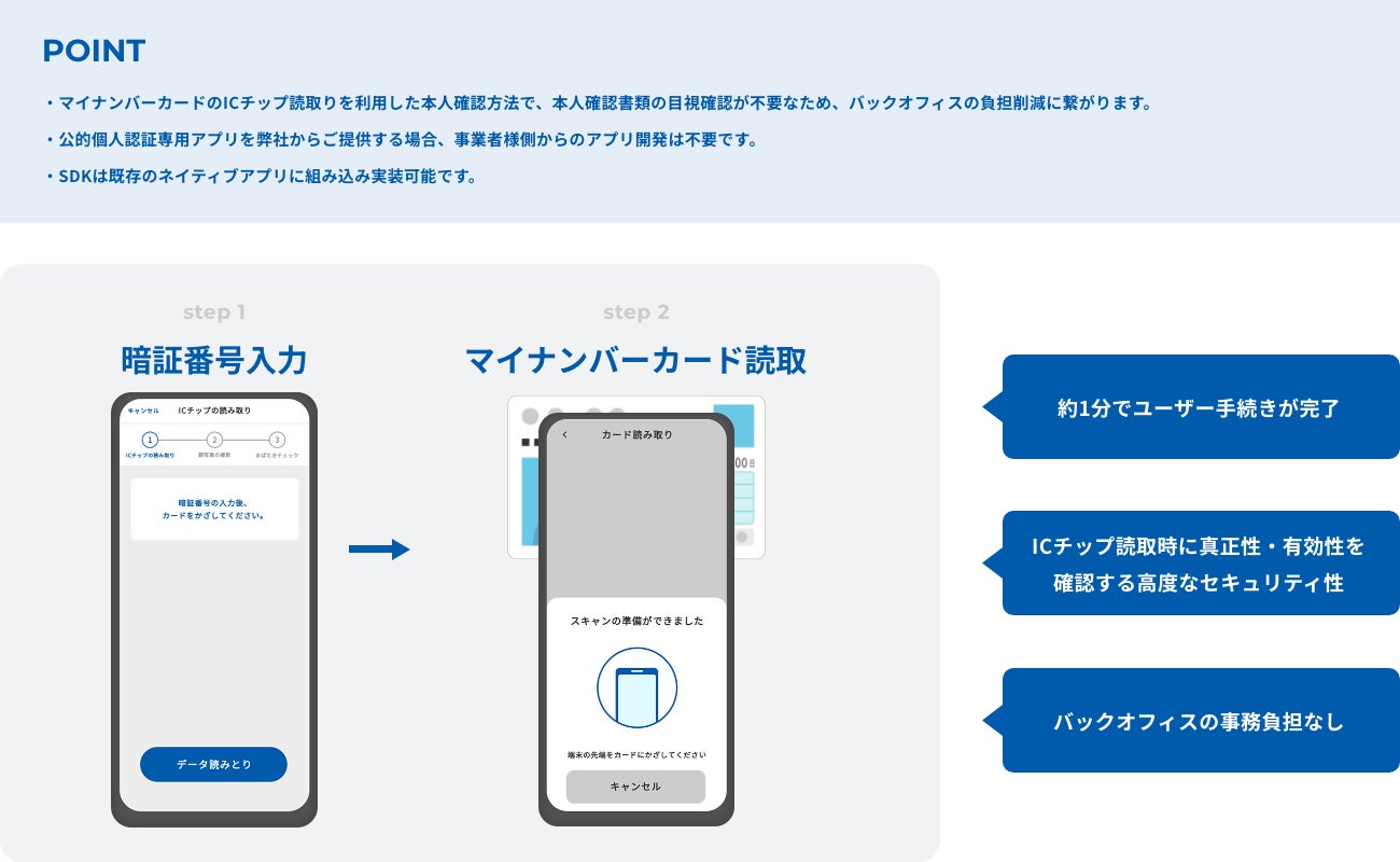 マイナンバーカードの IC チップに搭載された電子証明書を利用し、本人確認書類の偽造や他人によるなりすまし、データの改ざんといった不正を防止することで、安全かつ確実な本人確認を実現するサービスです。