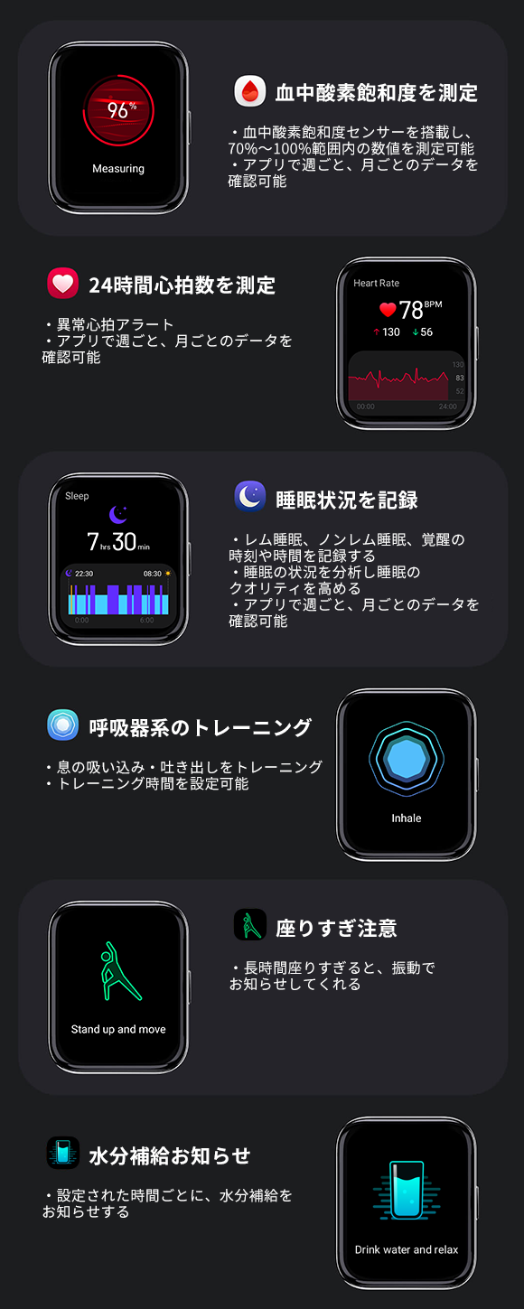 3. 100種類の運動モード搭載、24時間血中酸素飽和度や心拍数などの測定も可能。