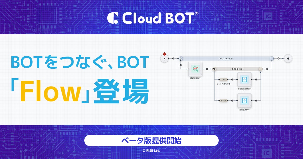 株式会社C-RISE(本社:富山県高岡市、代表取締役:村井 将則)は、クラウド型のRPAサービス「クラウドBOT®」において、複数のBOTを繋いで一つのワークフローを作成できる新機能『Flow』のベータ版をリリースしたことをお知らせいたします。