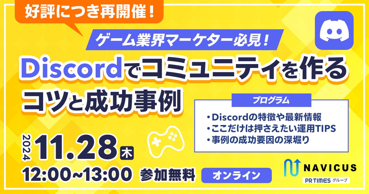 国内外のゲーム事業会社様のファンコミュニティ作りを、SNSを通じてご支援している株式会社NAVICUS(本社:東京都千代田区、代表取締役:武内 一矢、以下:NAVICUS)は、2024年11月28日(木)に無料ウェビナー「ゲーム業界マーケター必見!Discordでコミュニティを作るコツと成功事例」を開催いたします。