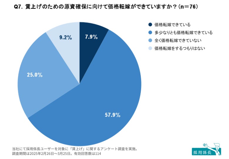 Q1で賃上げを「実施する予定」と回答した事業所(n=76)へ、価格転嫁の状況について質問したところ、「多少なりとも価格転嫁できている」が過半数を占めました。「価格転嫁できている」と回答した事業所を合わせると、65.8%の事業所が何らかの形で価格転嫁を実施していることが分かります。