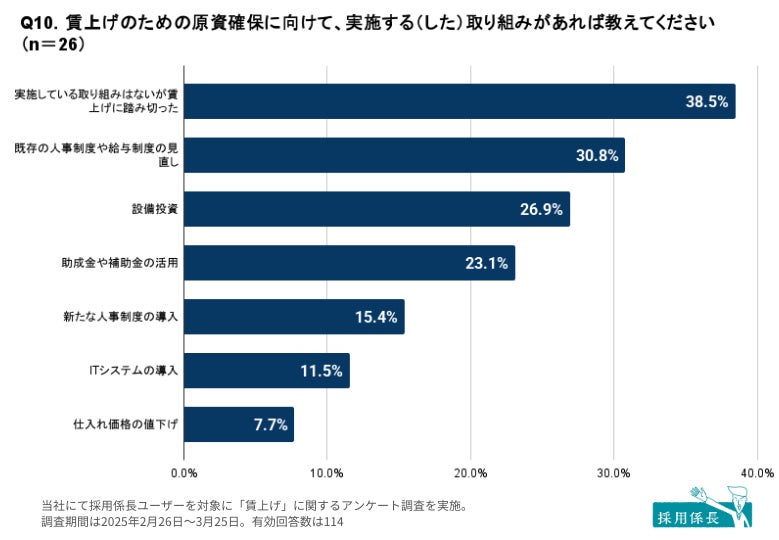 2位以下には「既存の人事制度や給与制度の見直し」「助成金や補助金の活用」「設備投資」「新たな人事制度の導入」が続いています。価格転嫁を実現している事業所の多くが販売価格の値上げだけでなく、複数の取り組みを組み合わせて原資確保に努めていることが読み取れる結果となっています。