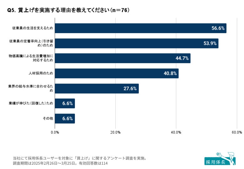 賃上げ理由については、「従業員の生活を支えるため」が最多です。2位には「従業員の定着率向上(引き留め)のため」が続き、いずれも半数以上の事業所が回答しました。