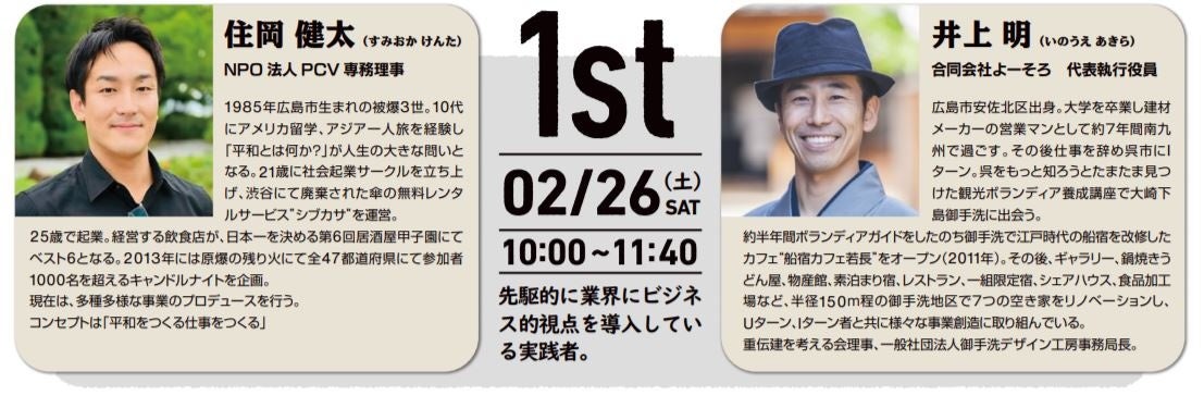 広島県内のソーシャルビジネスの実践者による講演を通じて、主に広島の企業,行政,NPOの皆様にソーシャルビジネスについての知見を深めていただくとともに、自分ゴトとして関心を持ってもらうことを目的としています。