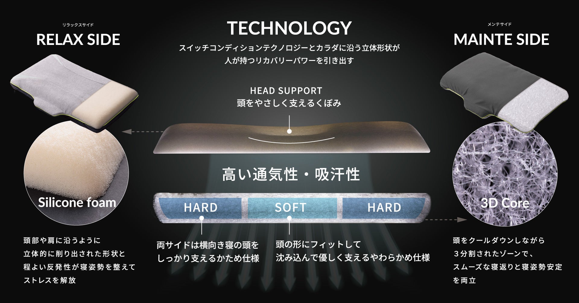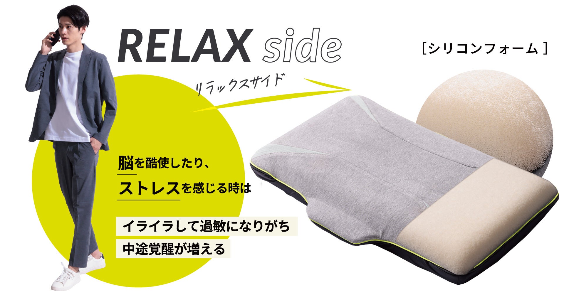 「ベスコンピロー」はストレスを解放したいときはリラックスサイド、肉体を酷使したときはメンテサイドと2種類の睡眠タイプを選んで使用することができます。