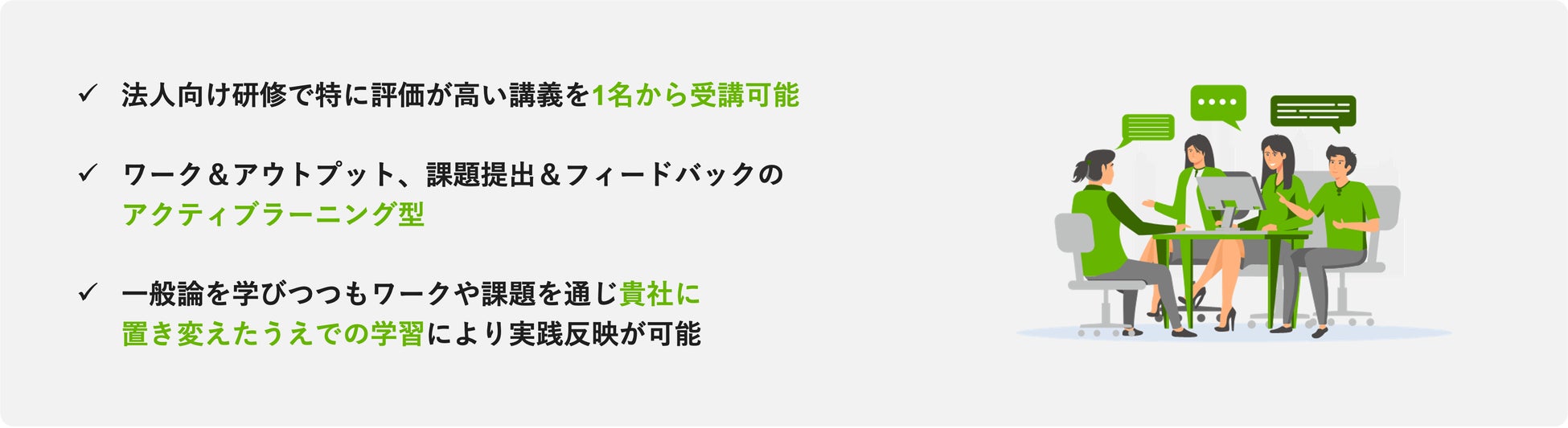 ワーク&ディスカッション、課題提出&フィードバックを通じて、学びを自社商材や業務に置き換えて定着。