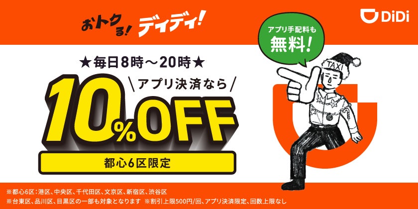 DiDiモビリティジャパン株式会社(本社:東京都港区、代表取締役社長:和久山 大輔)が提供するタクシー配車アプリDiDi(以下:ディディ)は、2024年12月14日(土)より、東京都心6区において全ての利用者を対象に、乗車料金が8時〜20時までの間最大10%オフになるキャンペーンを開始します。