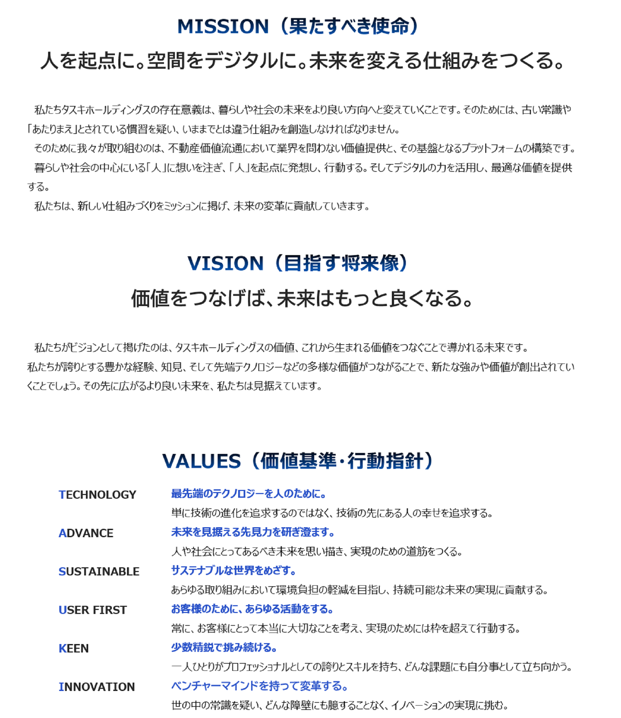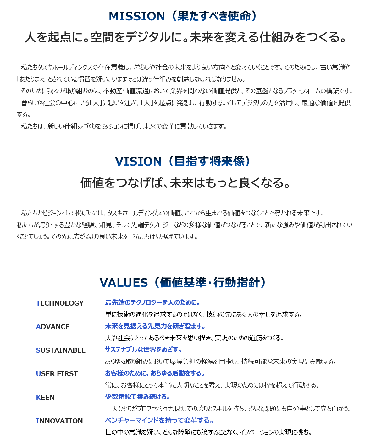 私たちタスキホールディングスの存在意義は、暮らしや社会の未来をより良い方向へと変えていくことです。そのためには、古い常識や「あたりまえ」とされている慣習を疑い、いままでとは違う仕組みを創造しなければなりません。