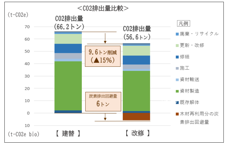 One Click LCA※2を用いて町屋ホテルの1棟を対象に、リフォーム工事に使用した個々の資材データ、使用燃料や廃棄物量の現場実績値をもとにエンボディドカーボン※3と炭素固定量を算定。エンボディドカーボンは約57トンで仮に同じ仕様で建替えた場合と比べて約15%のCO2排出量を削減することができます。建物に使用する木材の炭素固定量の合計は約26トンで40年生のスギ約85本分に相当します。柱や梁、小屋組などの木材を再利用し建物解体後の木材焼却で出る6トン分のCO2の排出を回避しています。