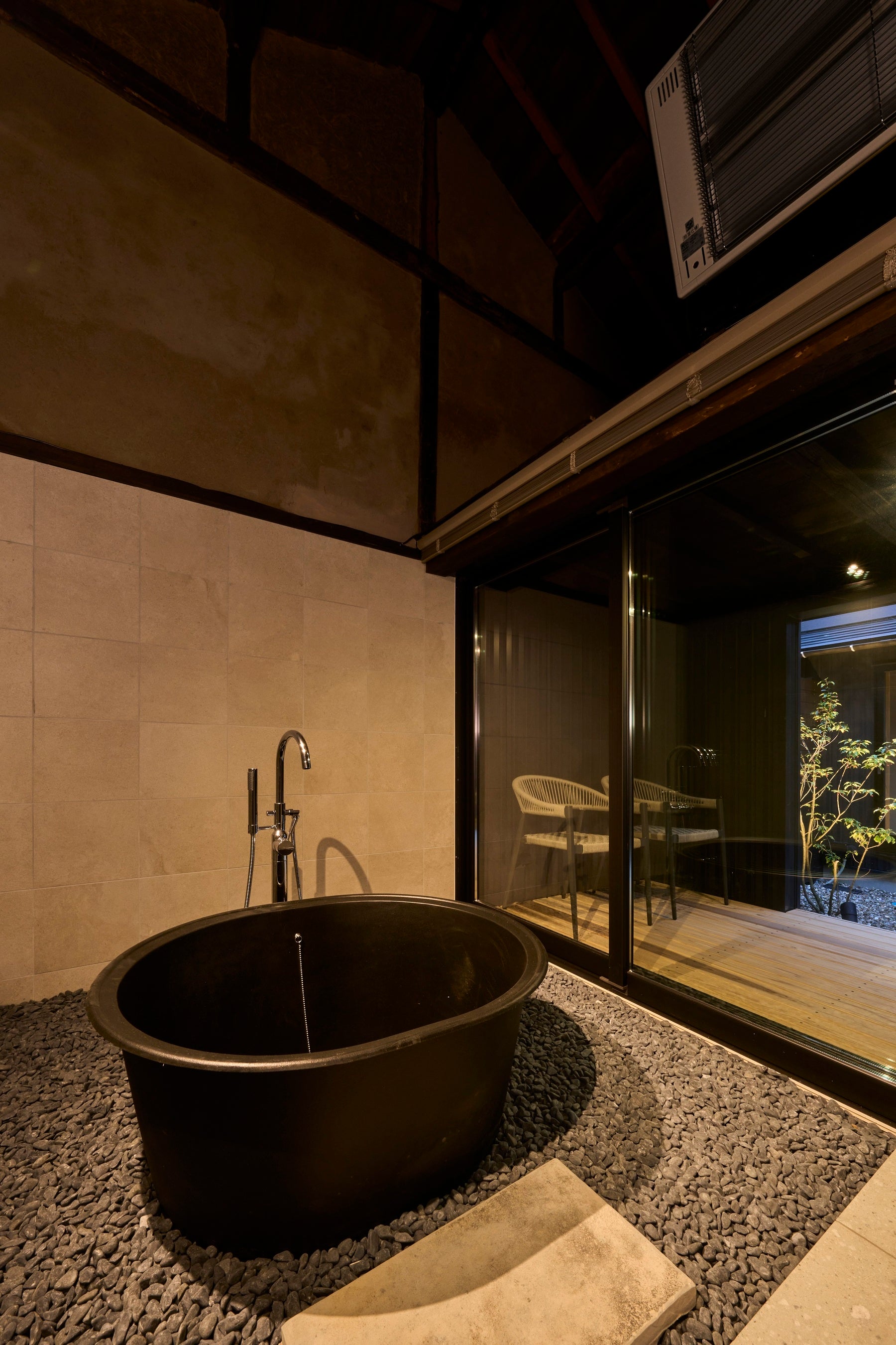 離れには湯屋を設け中庭が眺められる半露天風呂としました。