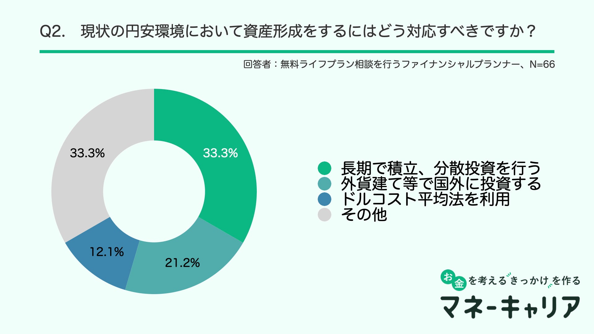 66人のFPに対し、「現状の円安環境において、一般の方が資産形成をしていくためにはどのように対応すべきか?」という質問を実施いたしました。「一時的な環境に左右されず長期、積み立て、分散を心がけて頂くよう対応する」「現状の円安が底とも限らないので、分散投資の必要性は話す」という長期・積立・分散で資産形成を進める答えが、約30%近く上がる結果となりました。この円安状況下でも一喜一憂せずに、長期・積立・分散を継続することを進めるFPが多いようです。