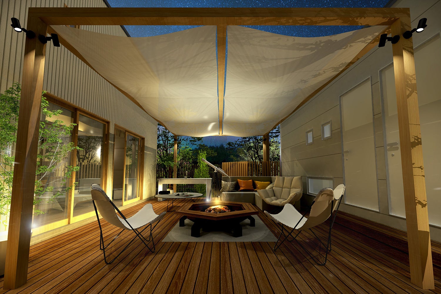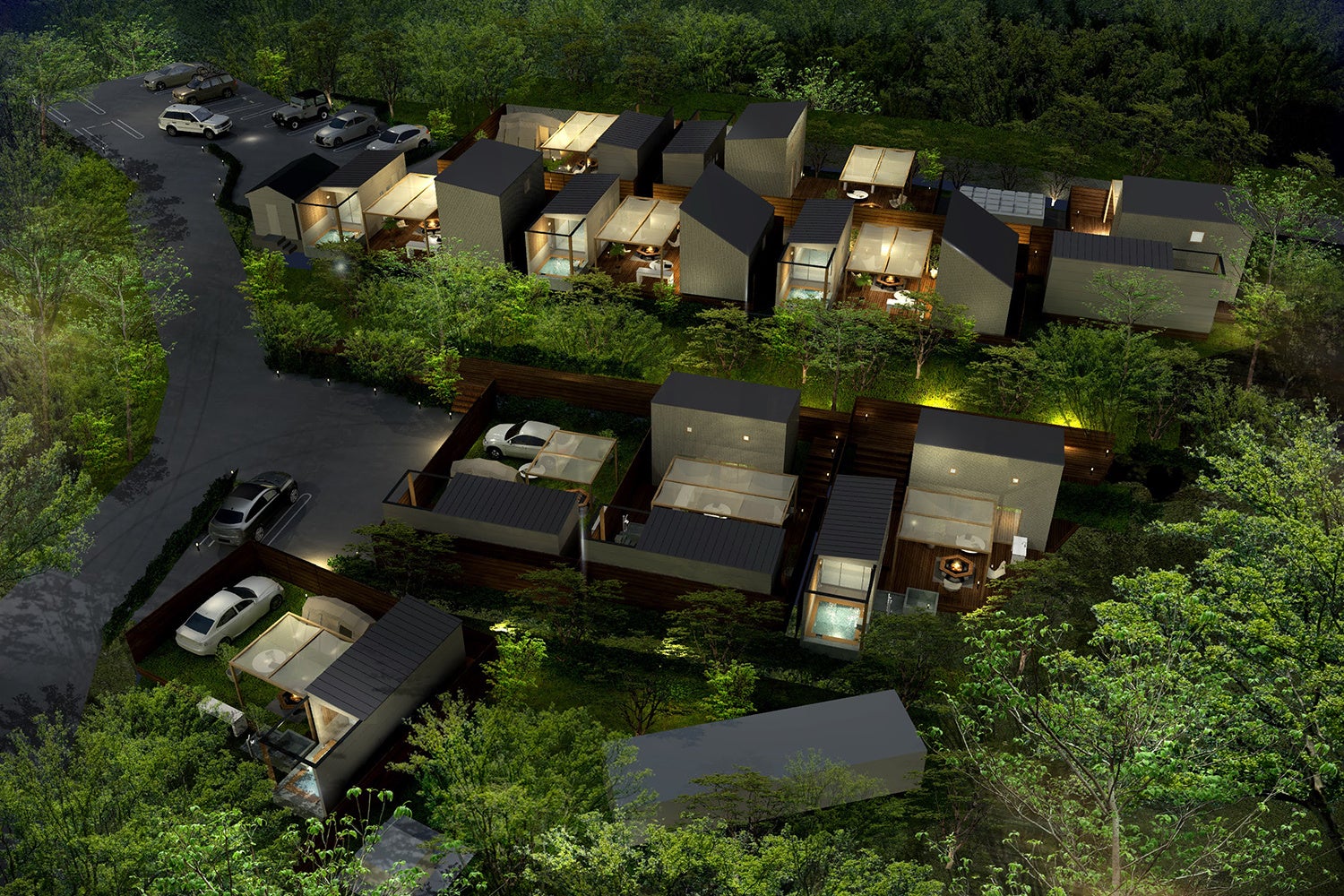 湯河原温泉郷の中心部、万葉公園を見下ろす高台に全10棟。各棟110㎡以上の贅沢な配置。専用BBQスペースでの焚火のBBQ。上質なアウトドア体験を快適なプライベート空間でお楽しみ頂けます。