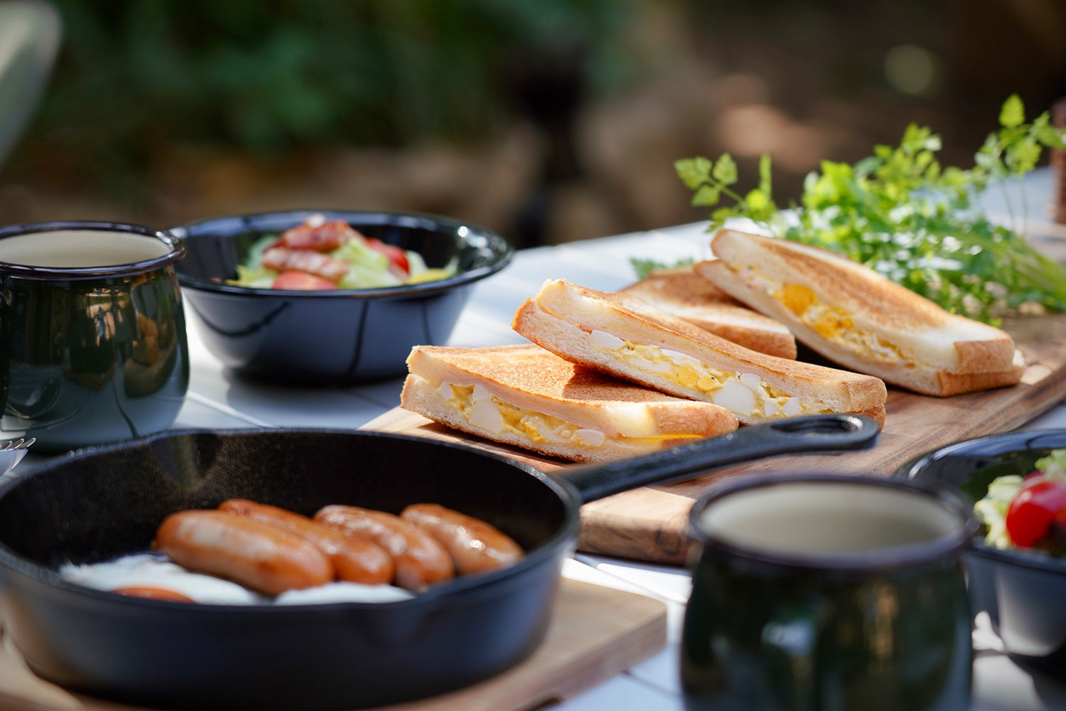 皿(平皿/ボール)、カップ、フォーク、スプーン、割り箸、栓抜き、フライ返し、トング、菜箸、お玉、ピザカッター、包丁、カッティングボード、スキレット、鍋、ホットサンドメーカー、飯ごう、キッチンペーパー