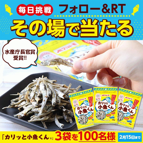 マルトモ株式会社(社長:今井均 本社:愛媛県伊予市)は、「カリッと小魚くんⓇ30g」の水産庁長官賞受賞を記念して、抽選で100名様に本商品がその場で当たるフォロー&リツイートキャンペーンを実施いたします。