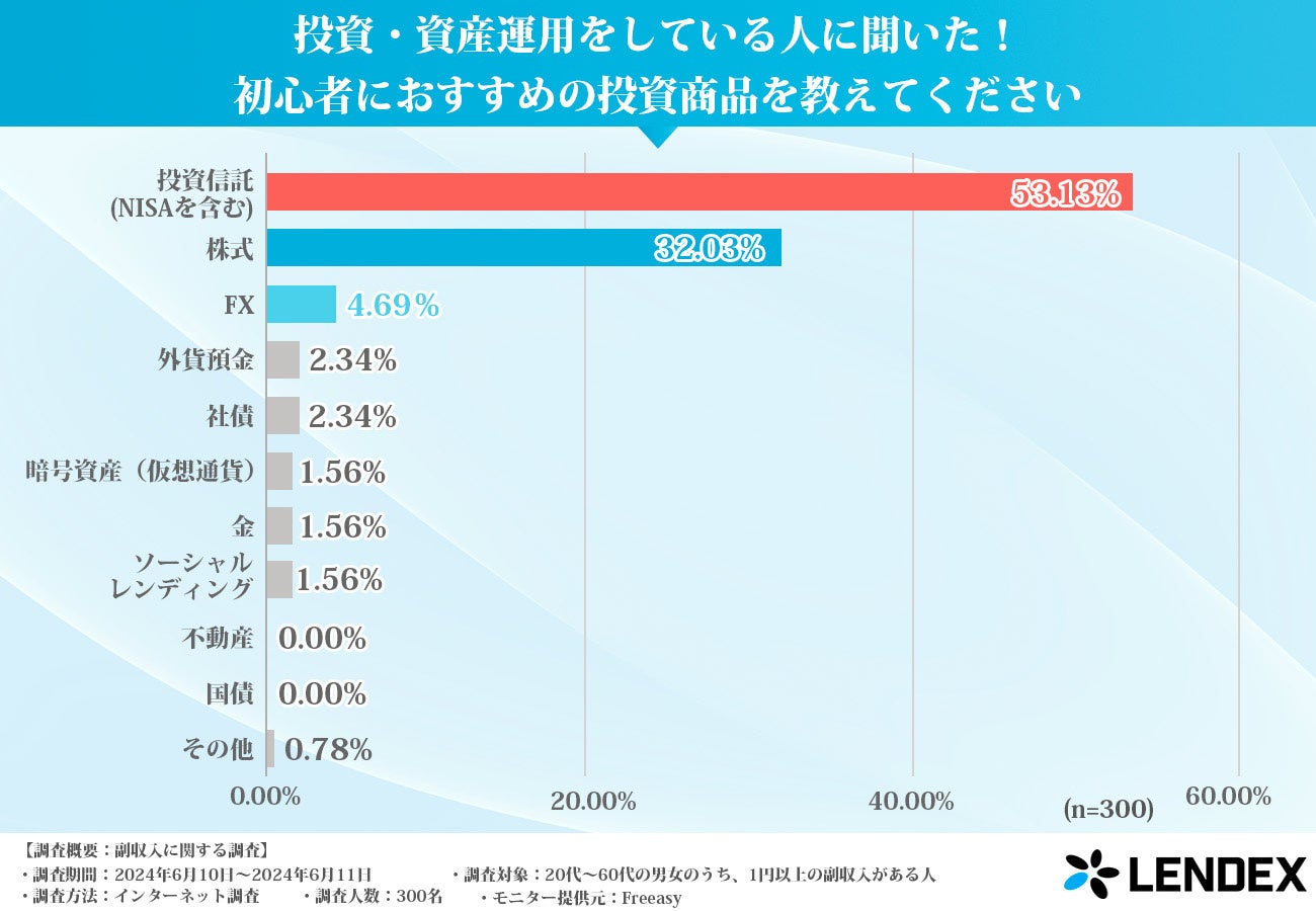 投資初心者におすすめの投資商品として最も多く挙げられたのは、投資信託(NISAを含む)で、53.13%の人が推奨しています。