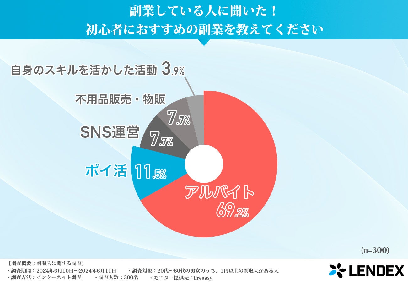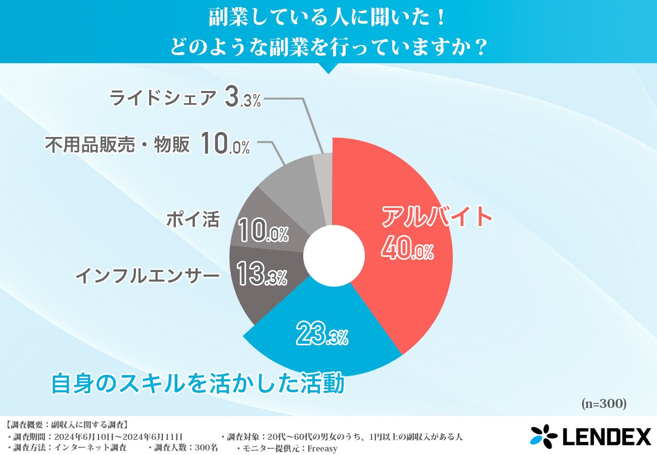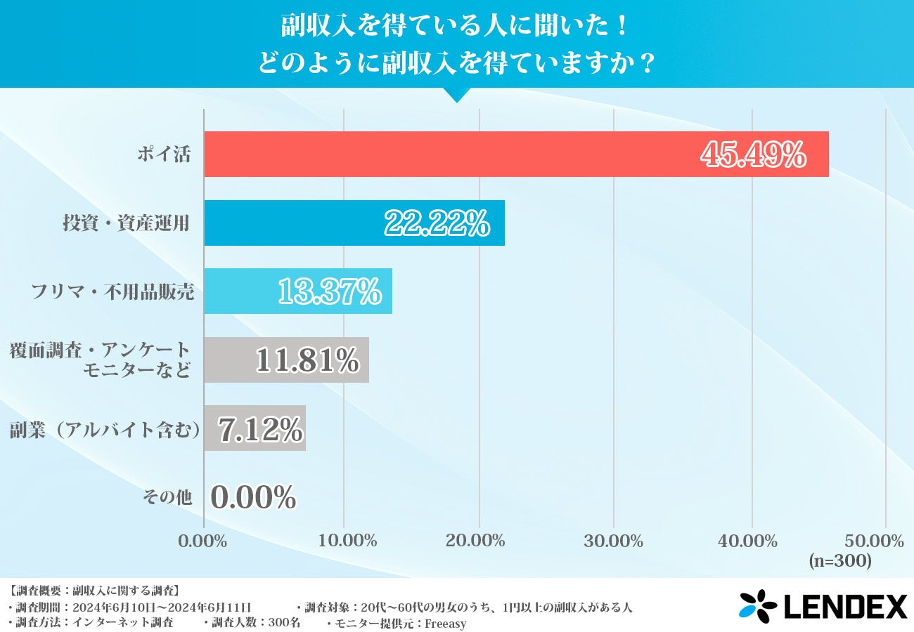 株式会社LENDEX(本社所在地:東京都渋谷区、代表取締役:中村 智)は、20代から60代の男女のうち1円以上の副収入を得ている方を対象に、「副収入」に関する調査を行いました。