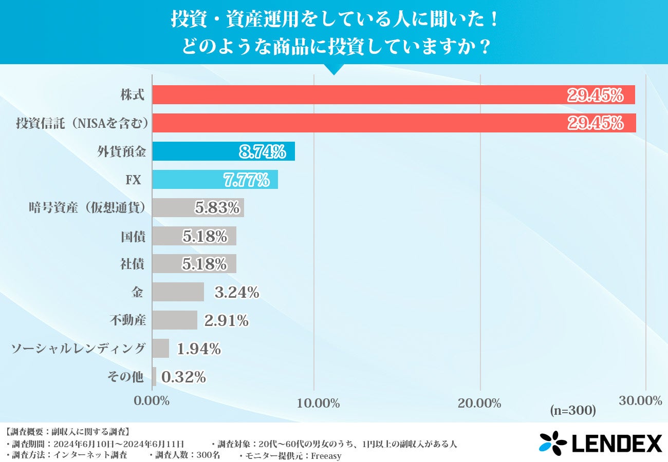 投資・資産運用を行っている人々の間では、株式と投資信託(NISAを含む)が最も人気で、それぞれ29.45%が選んでいます。ソーシャルレンディングはまだ知名度が低いものの、今後注目される可能性があります。