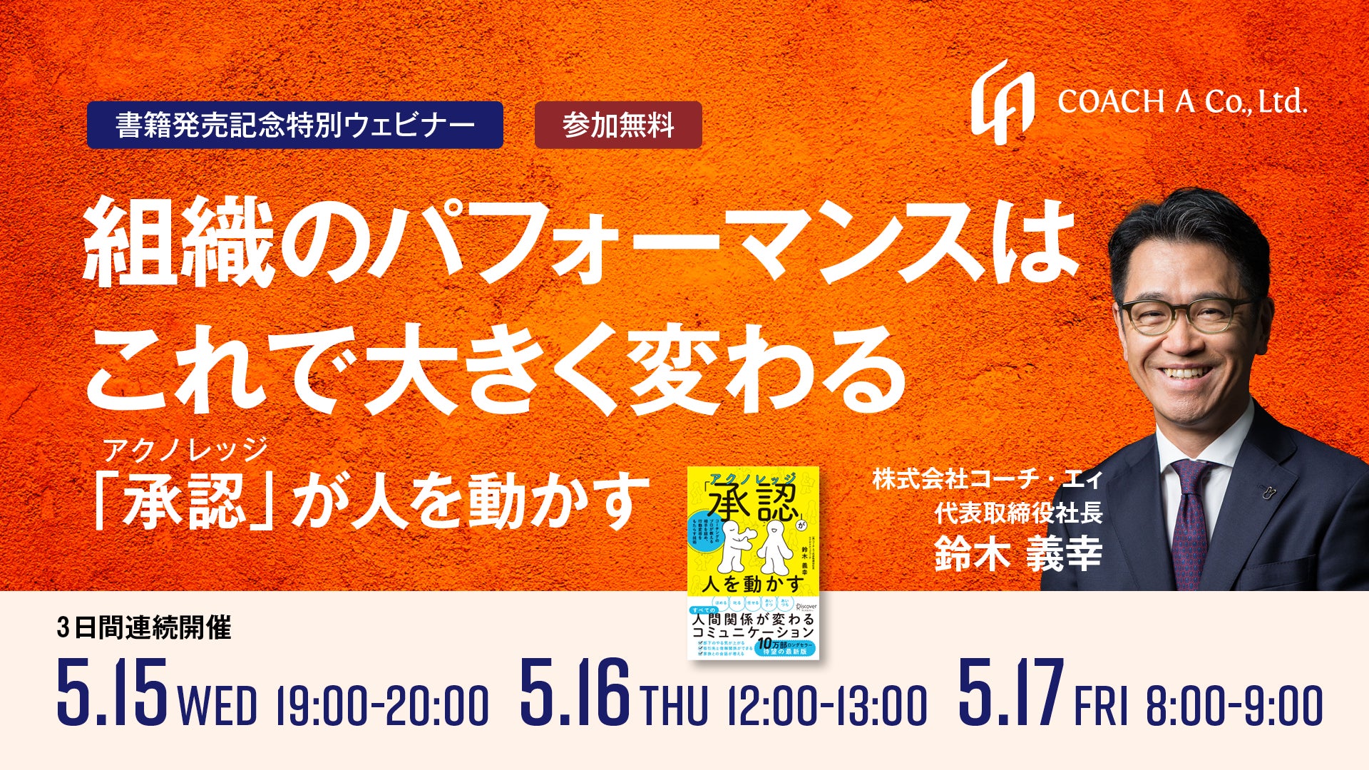 当社は、「組織のパフォーマンスはこれで大きく変わる~「承認」が人を動かす~」をタイトルに、2024年5月15日・16日・17日の3日連続で、書籍発売記念特別ウェビナーを開催いたします。本ウェビナーは、株式会社コーチ・エィの代表取締役社長 鈴木義幸による著書 『「承認」が人を動かす コーチングのプロが教える 相手を認め、行動変容をもたらす技術』 が、2024年4月19日に刊行されたことを記念して開催するものです。