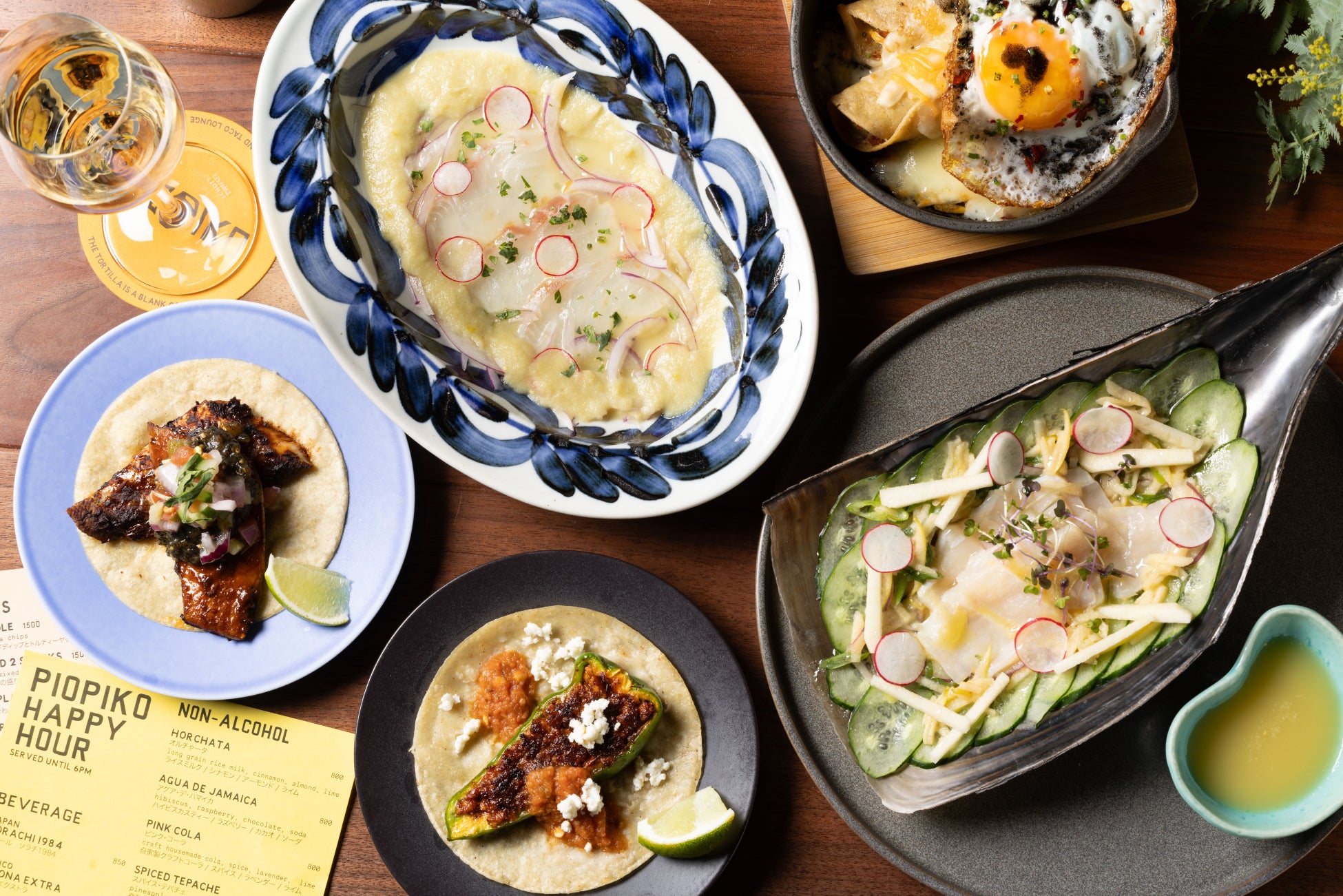 ピオピコ(PIOPIKO)のアメリカン・メキシコ料理は、「伝統的なメキシコ料理」をオリジナルにしながら、多くのイノベーションを取り入れています。ウェス自身、メキシコから移住した家族を持つメキシコ系アメリカ人でありながら、世界中のテイストが混在する大都市LAで育った影響をダイレクトに受け、料理にもグローバルなツイストを多く加わえています。多種多様な移民カルチャーが根付くLAで、和食、中華、タイ料理、イタリアン、フレンチなど、幅広い食のスタイルに触れてきた彼の感性が料理に表現されています。ピオピコ(PIOPIKO)には、銅で造られたアイコニックなDJブース、叢-QUSAMURA-の観葉植物、陶芸家の浜名一憲により造られたセラミックアートなど、アートやアクセントが豊富に点在しています。京都の名工房、金網つじが作る京金網の技術を活かした編み照明は、雲のように銅でライニングされた天井から吊るされ、その下にはアメリカのアーティスト兼アーボリスト(樹木の栽培や手入れ方法に詳しい専門家)のイド・ヨシモトが手がけたウッドパネルが美しいバーカウンターが独創的な空間を作り上げています。